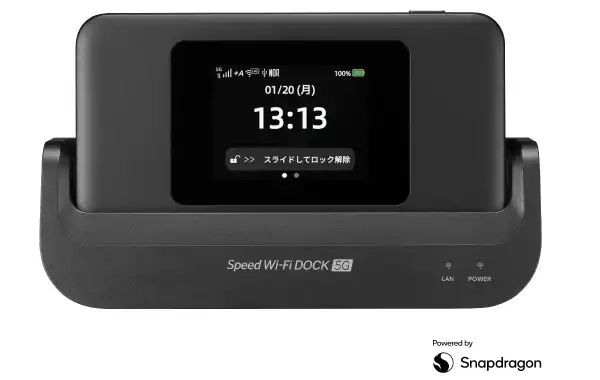 そして、この機種が革新的なのは、付属の専用ドック(DOCK)です。自宅やオフィスに戻ったら、このモバイルルーターをドックに「カチッ」とセットするだけで、瞬時に据え置き型のホームルーターへと変貌します。このドックが、単なる充電台ではなく、LANポート(有線接続端子)を搭載している点が非常に重要です。